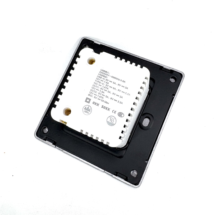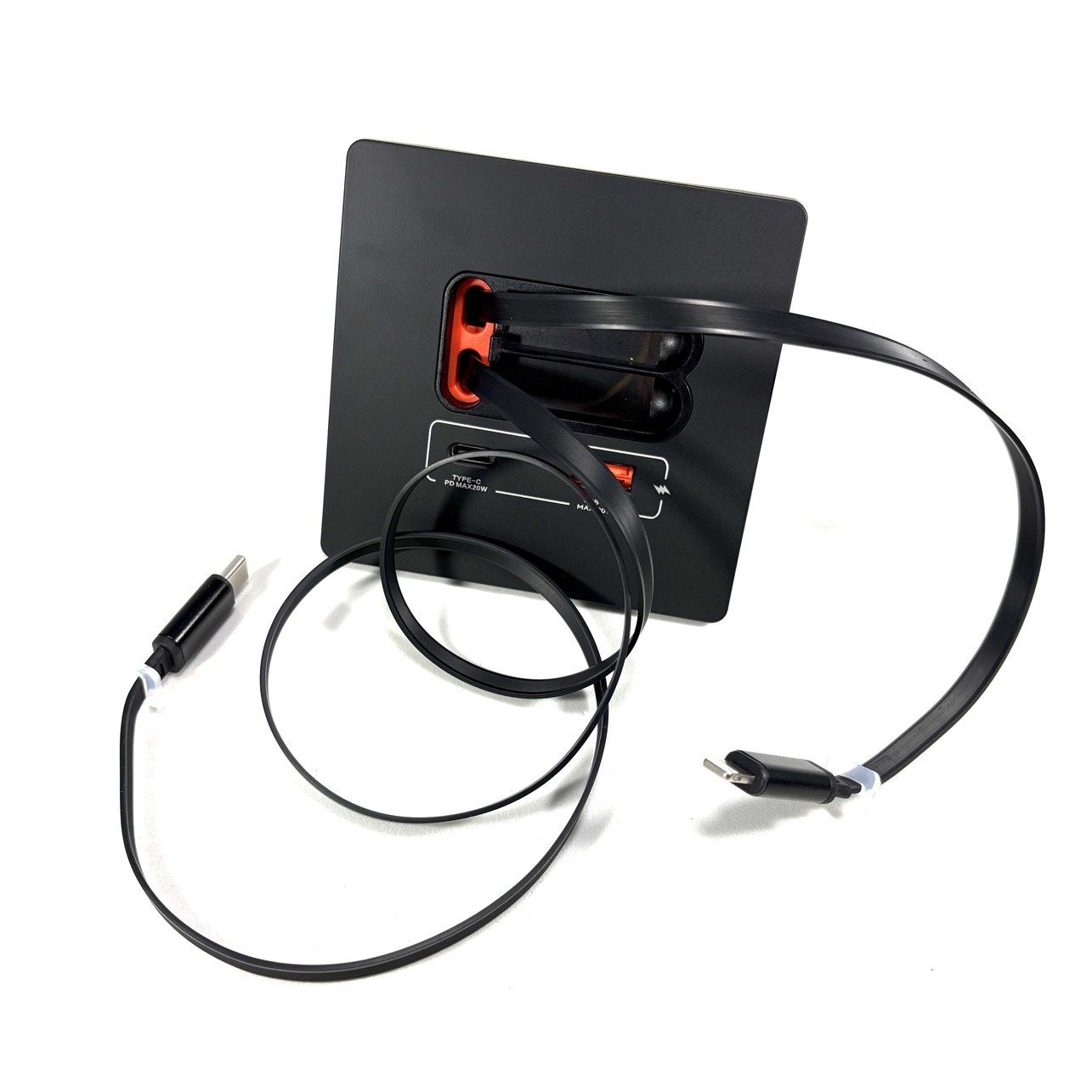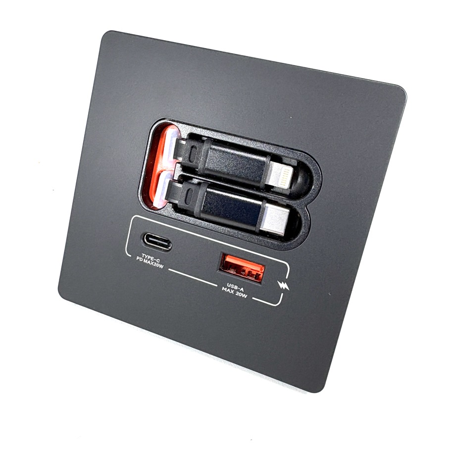Centro de carga para dispositivos móbiles con dos cables retráctiles, uno con conector USB-C y el otro con conector Lightning además cuenta con dos puertos para insertar cable USB y un USB-C. Proporciona una carga rápida y sin la necesidad que el usuario posea cable o cargador para usarlo. Puede ser empotrado en la pared o en un mueble con un diseño de factor pequeño y de bajo perfil no ocupa espacio en donde sea instalado.
